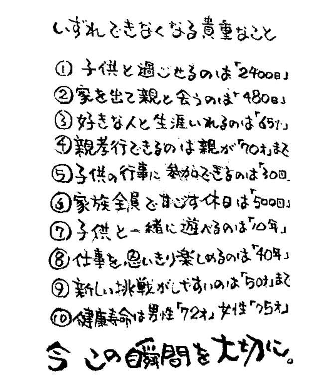 若い頃はこんな事、微塵も思わなかった。 歳取ると、今、この瞬間瞬間を大切にしないと…と思う。 もう終わった項目が多いけど、今「気付く」事が大切。 若者の皆さんに知って欲しい。