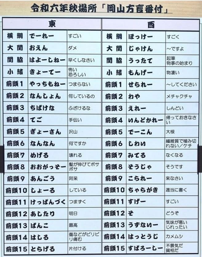 誰が考えていらっしゃるのか分かりませんが、昨年の「岡山方言番付」が出ています。