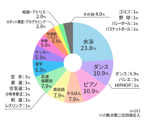 今、子供の習い事で人気が高いのは「水泳」「ダンス」「ピアノ」だそうです。