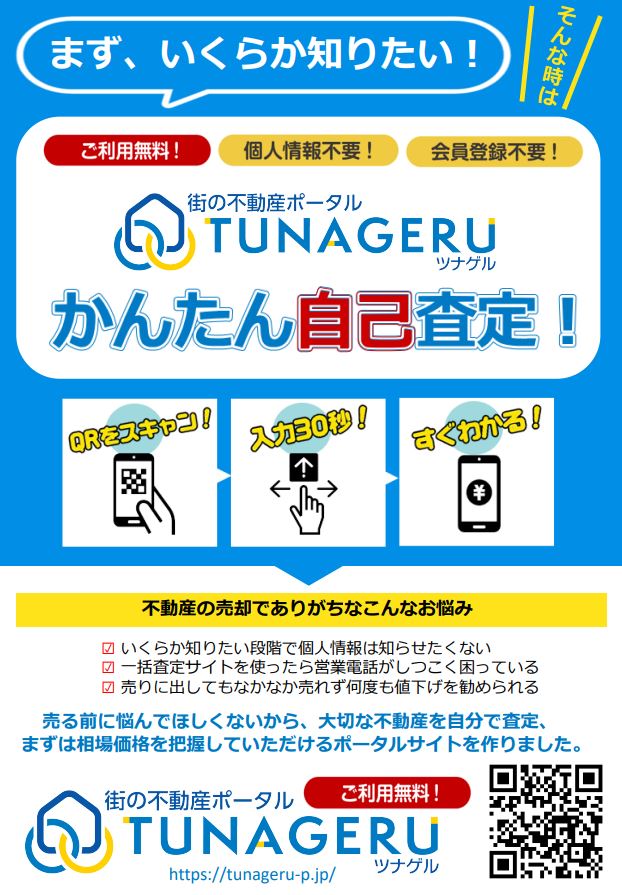 「tunageruさんの自己査定サイト」をご参照下さい! 「登録無し」「個人情報入力無し」「不動産屋やサイトからの連絡一切無し」、しかも「無料」で売却不動産の査定価格を調べる事が出来ます。 一括査定サイトみたいな煩わしさもありません。 https://tunageru-p.jp/ この記事の左にある(緑色の)当社「売却専門ホームページ」にも詳しく掲載しております。