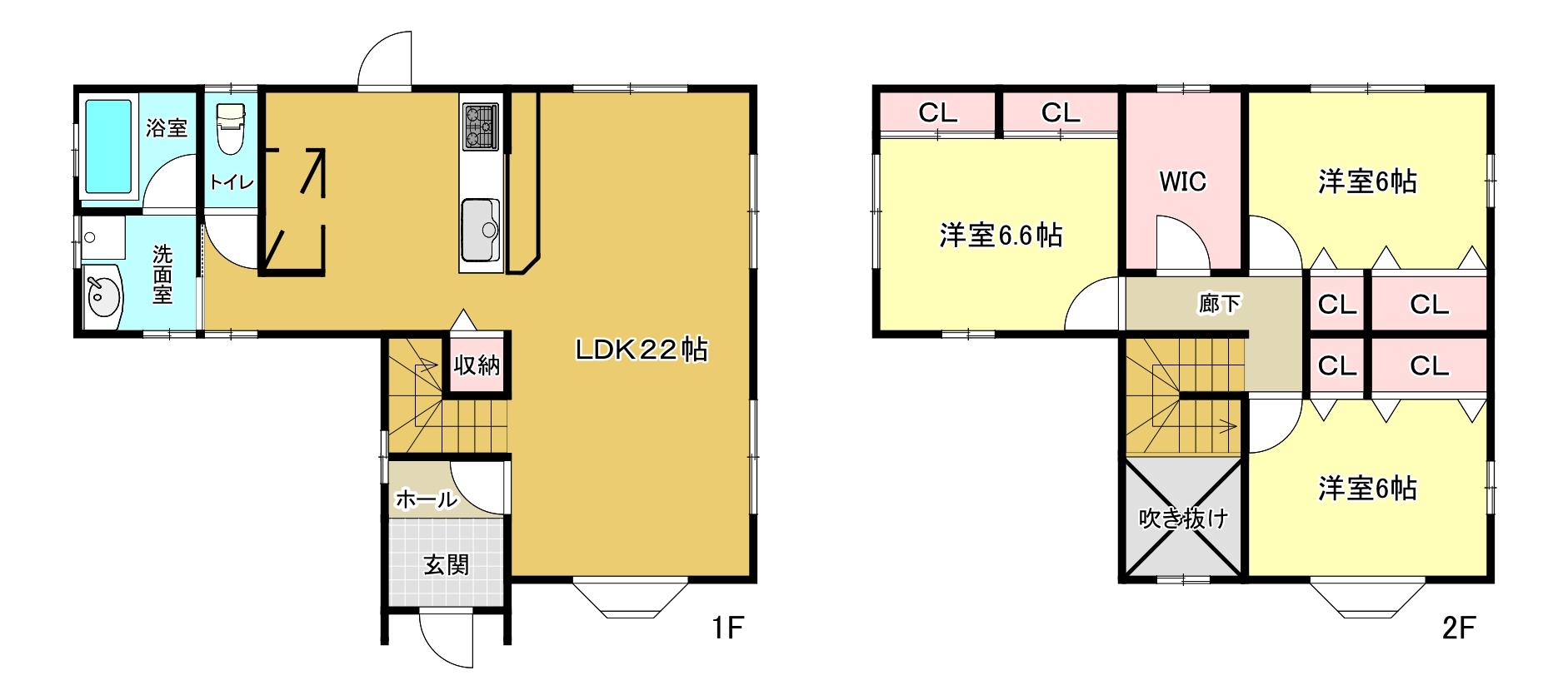 | 間取り詳細 | 1階:LDK22帖 2階:洋室6帖×3部屋 W.I.C. |