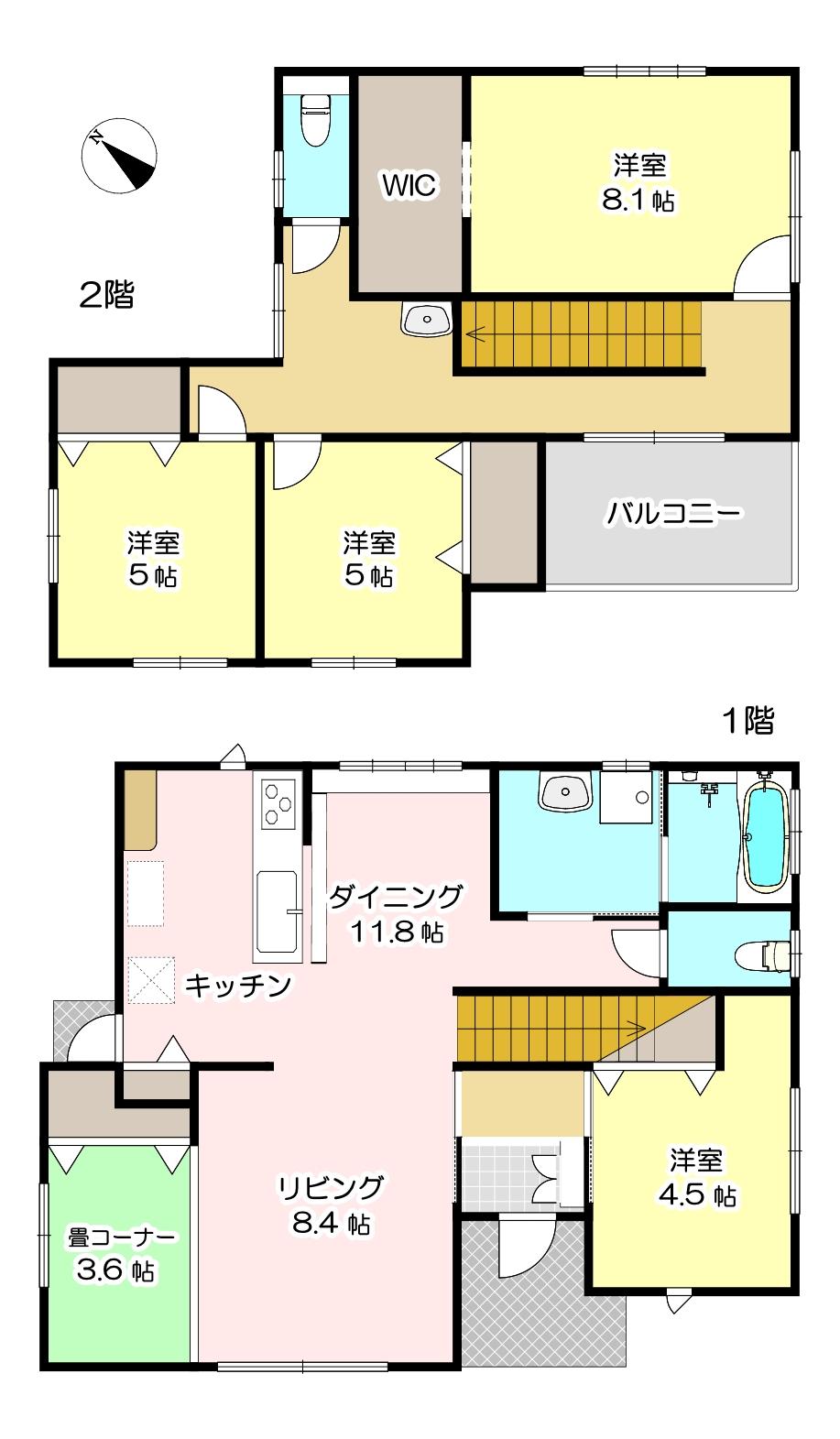 | 間取り詳細 | 1階:LDK20.2帖 洋間4.5帖 畳コーナー3.6帖 2階:洋間5帖×2部屋 洋間8.1帖 W.I.C. |