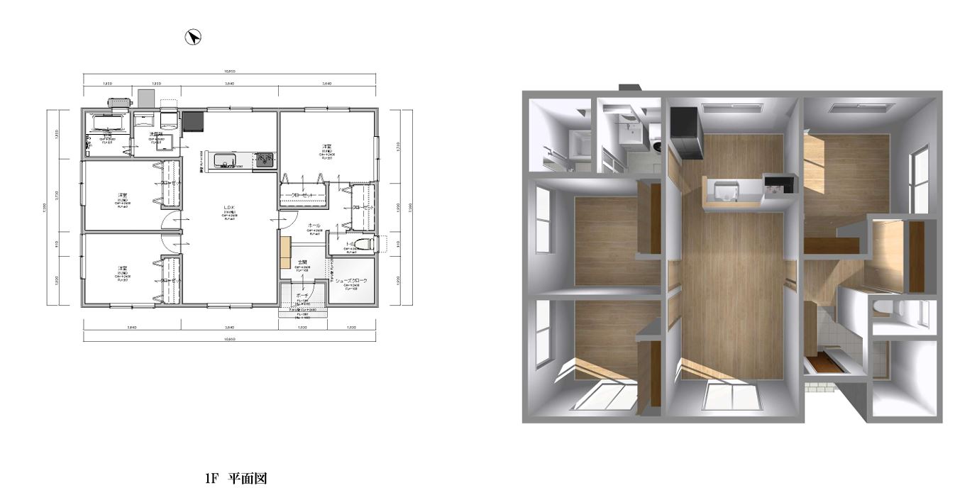 セットプラン例。平屋24坪・3LDKタイプ。土地+建物(省令準耐火仕様・オール電化・給排水・電気引込)