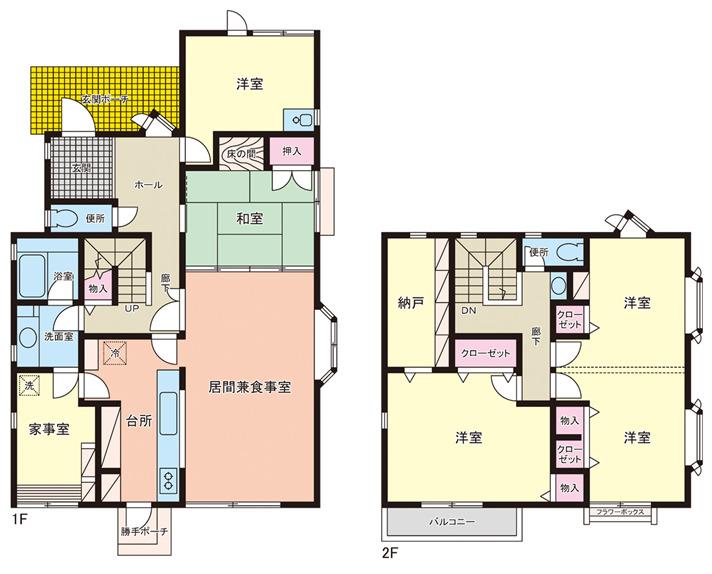 | 間取り詳細 | 1階:LDK 和室6帖 洋室6帖 家事室 水廻 2階:洋室6.5帖×2部屋 洋室9.5帖 W.I.C. |