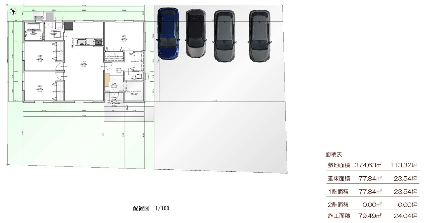 セットプラン例。平屋24坪・3LDKタイプ。土地+建物(省令準耐火仕様・オール電化・給排水・電気引込)で5,640万円(税込)