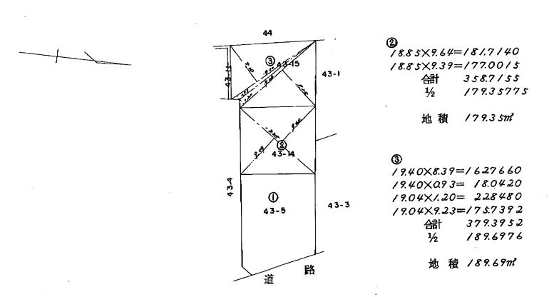 | 備考 | 前面道路:私道(位置指定道路141㎡)及び南側水路(20.64㎡)各々1/7持分有 |