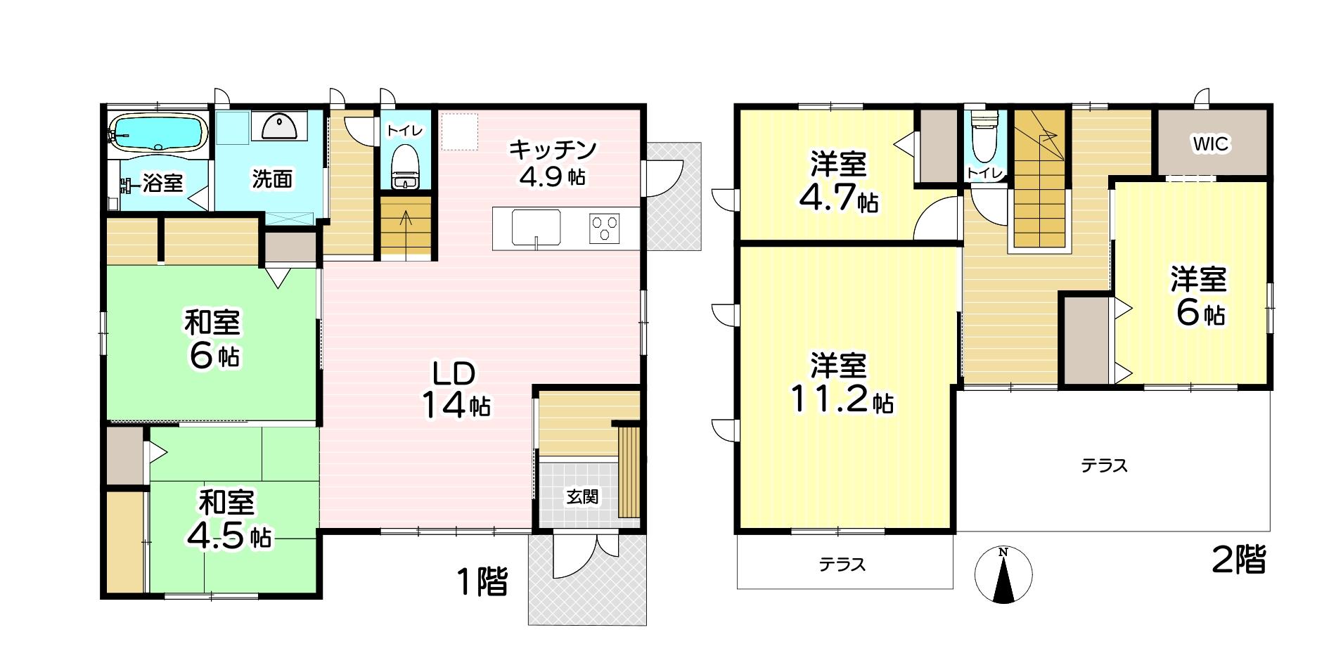 | 間取り詳細 | 5LDK 1階:LDK18.9帖 和室6帖・4.5帖 2階:洋室4.7帖 洋室6帖 洋室11.2帖 W.I.C. |