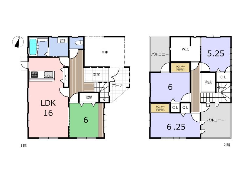 | 間取り詳細 | 1階:LDK16帖 和室6帖 2階:洋間5.25帖 洋間6帖 洋間6.25帖 W.I.C. |