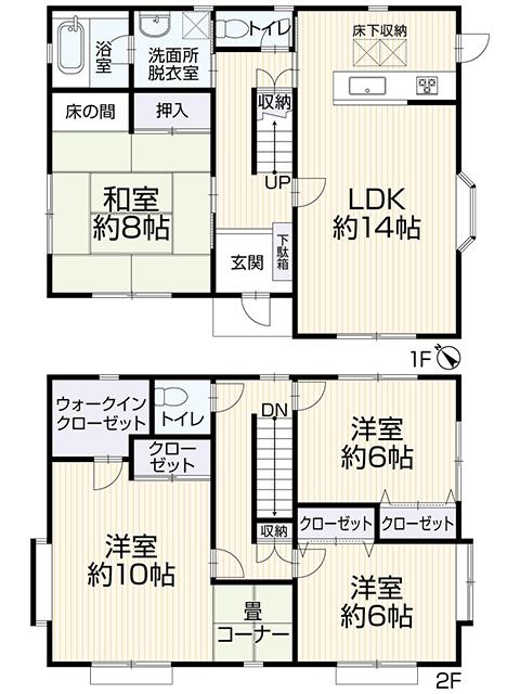 | 間取り詳細 | 1階:LDK14帖 和室8帖 2階:洋間6帖×2部屋 洋間8帖 W.I.C. |