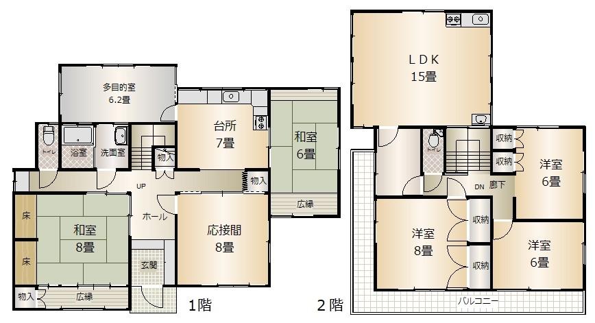 | 間取り詳細 | 8LDK 1階:DK7帖 リビング8帖 和室6帖と8帖 多目的室6.2帖 2階:LDK15帖 洋間6帖×2部屋 洋間8帖 |