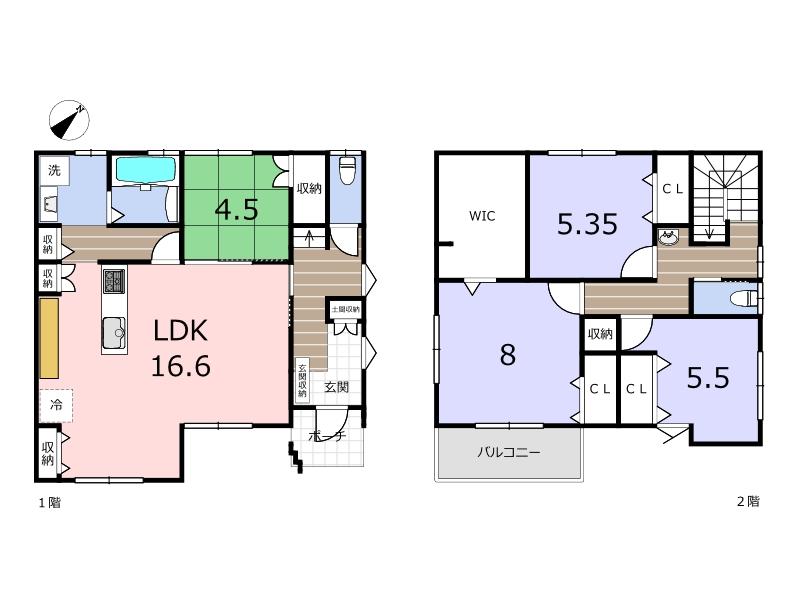 | 間取り詳細 | 1階:LDK16.6帖 和室4.5帖 水廻り 2階:洋間5.35帖 洋間5.5帖 洋間8帖 W.C.I. |
