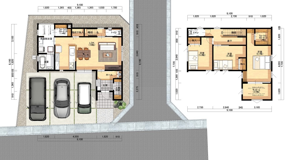 | 間取り詳細 | 1階:LDK16帖 水廻り 2階:洋間5.3帖×2部屋 洋間8.1帖 サンルーム3.5帖 W.I.C.2帖 |