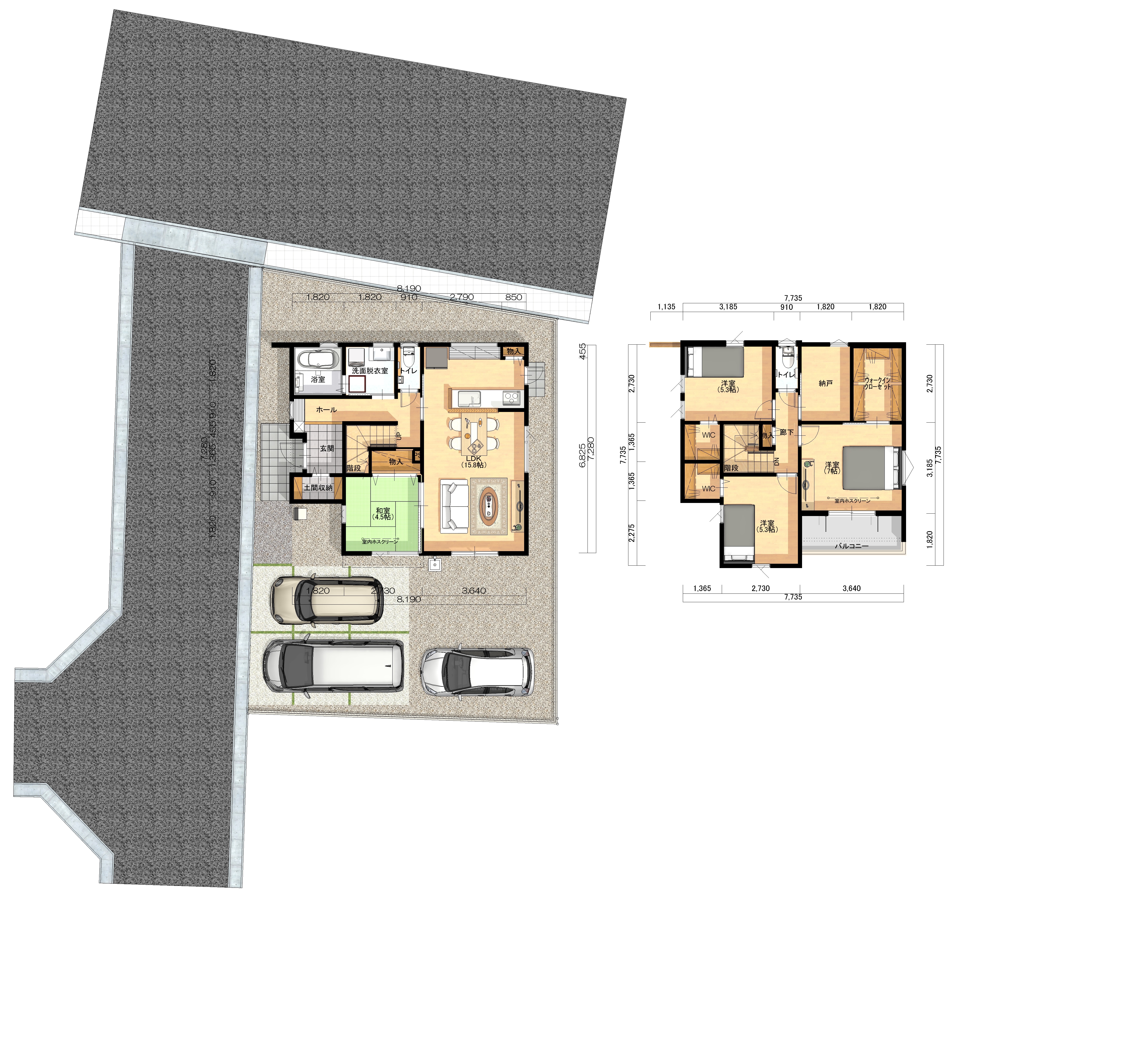 | 間取り詳細 | 1階:LDK15.8帖 和室4.5帖 2階:洋間5.3帖×2部屋 洋間7帖 W.I.C. 納戸 |