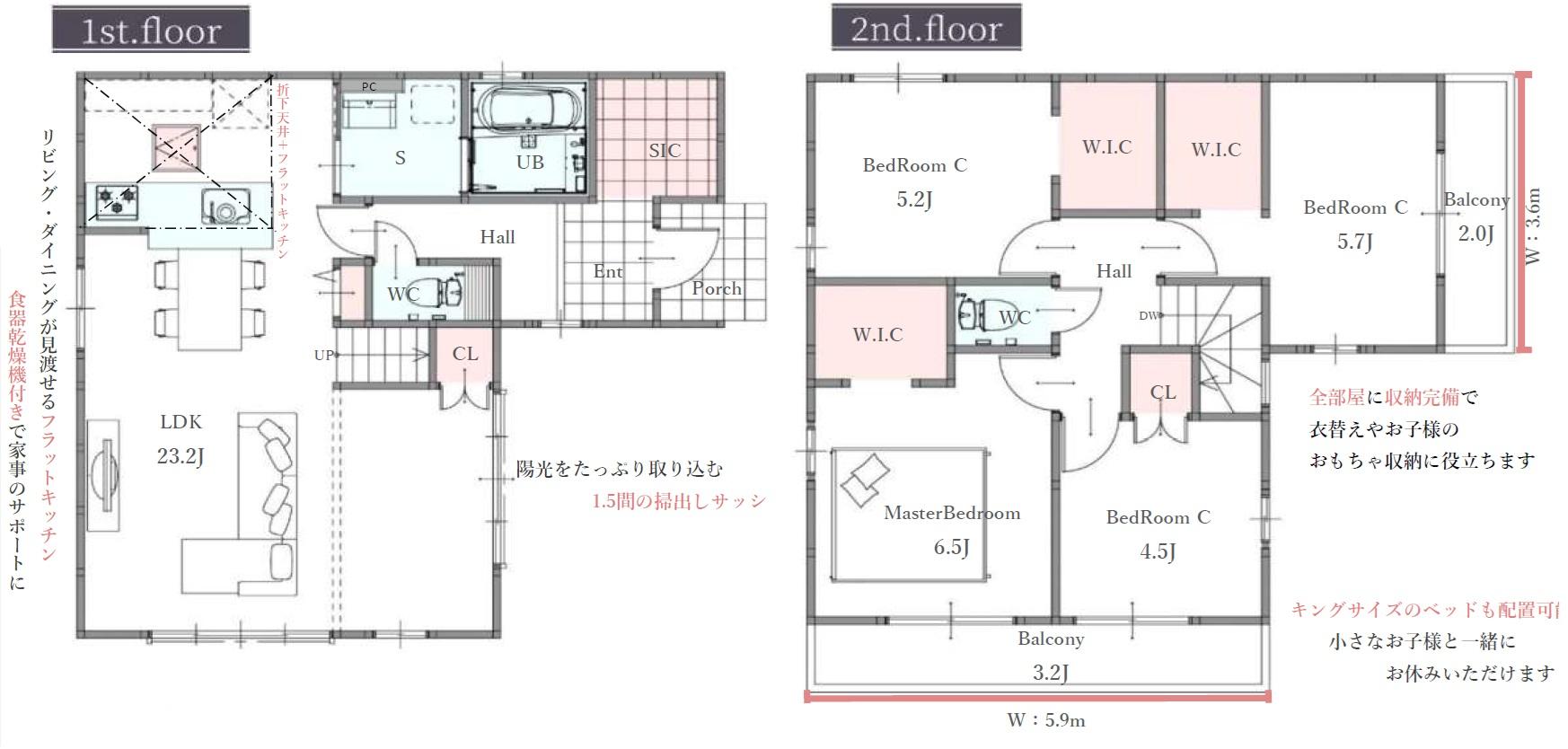 | 間取り詳細 | 1階:LDK23.2帖 洋間4.5帖 2階:洋間4.5帖 洋間5.2帖 洋間5.7帖 洋間6.5帖 W.I.C. |