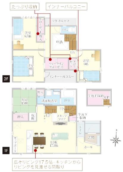 | 間取り詳細 | 1階:LDK17.5帖 和室4.5帖 1.5階:書斎 2階:洋間6帖 洋間6.5帖 洋間8帖 W.I.C. |