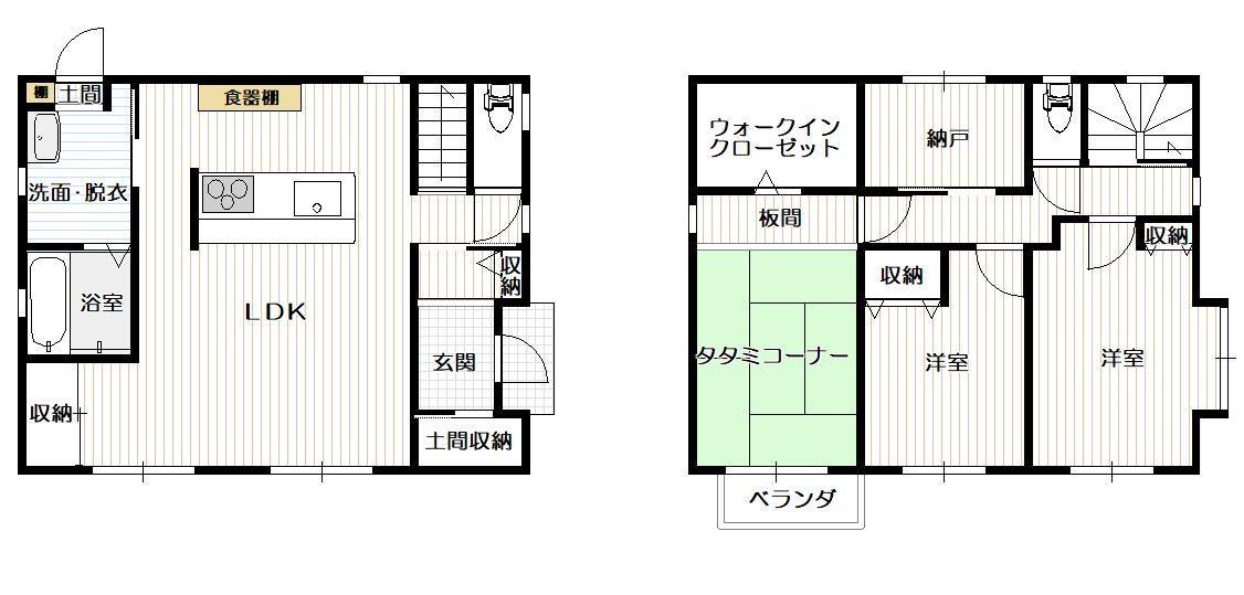 | 間取り詳細 | 1階:LDK 2階:洋室×2部屋 和室 W.I.C. 納戸 |