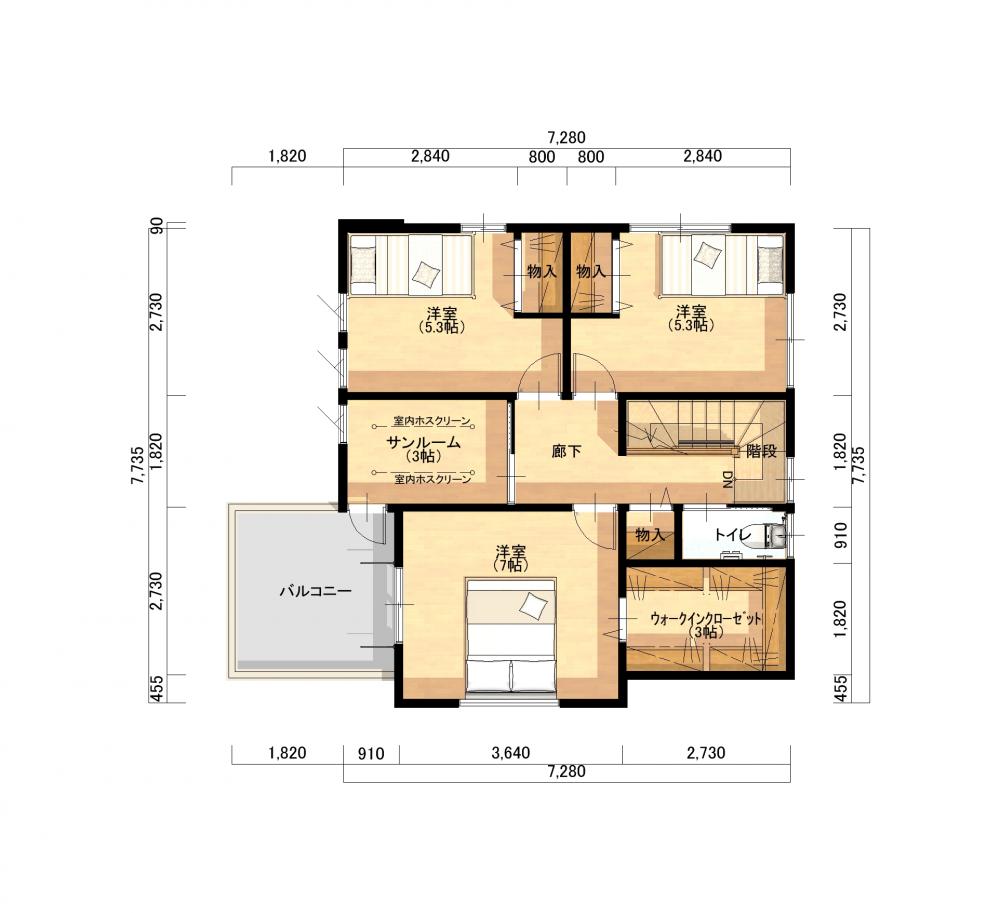 | 間取り詳細 | 1階:LDK16.8帖 和室4.5帖 2階:洋間5.3帖×2部屋 洋間7帖 W.I.C. サンルーム |