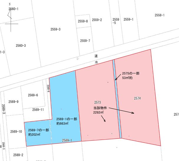 土地間の水路部も入っての売買です。大きな土地になります。