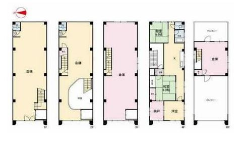 | 間取り詳細 | 1階~3階:各階1フロア 4階:3DK 5階:1ルームとバルコニー |