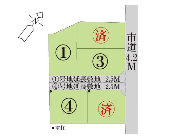 | 備考 | 水道負担金込価格。 建物高さ10m制限有。 ①号地の延長敷地には③④⑤号地の地役権設定有。 ④号地の延長敷地には①③⑤号地の地役権設定有。 ④⑤号地は電柱有。 |