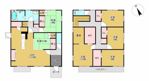 | 間取り詳細 | 1階:LDK17.25帖 和室4.5帖 和室6帖 2階:洋間6帖×3部屋 洋間7.25帖 W.I.C. 書斎 |