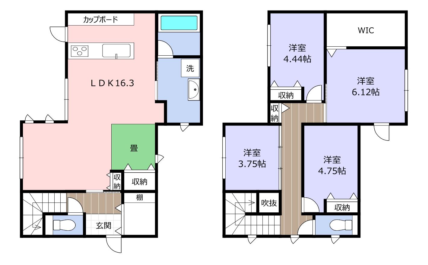 | 間取り詳細 | 1階:LDK16.3 タタミコーナー 2階:洋室3.75帖 洋室4.44帖 洋室4.75帖 洋室6.12帖 W.I.C. |