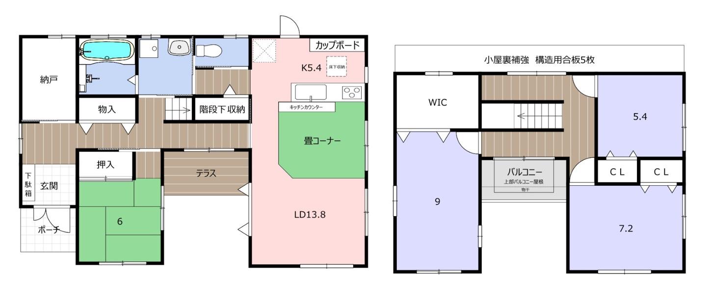 | 間取り詳細 | 1階:LDK19.2帖 和室6帖 2階:洋室5.4帖 洋室7.2帖 洋室9帖 W.I.C. |