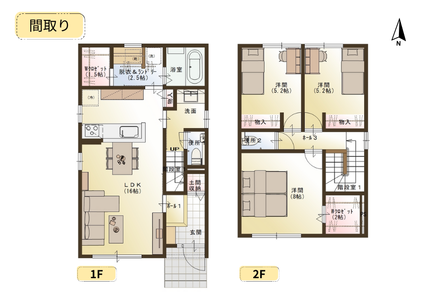 | 間取り詳細 | 1階:LDK16帖 水廻 ランドリースペース W.I.C.1.5帖 2階:洋室5.2帖×2部屋 洋室8帖 W.I.C.2帖 |